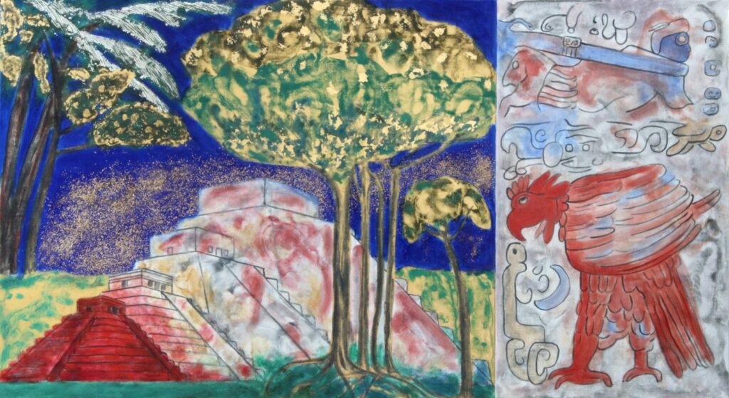 The chromatic figures and nudes explore an archetypal world where the real and imaginary fuse to create their own parallel universe.